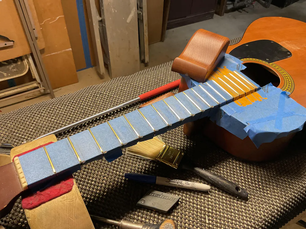 A guitars' fret ends need to be bevelled at a 35-degree angle and then rounded over to make for the most comfortable neck possible.