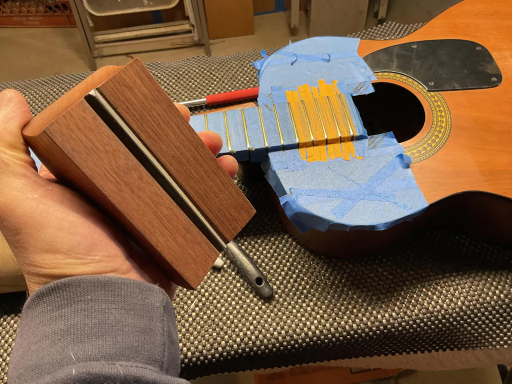 The smooth wood runs along the top of your frets and does no damage there while the file works on both sides, doing away with the need to change the position of the neck on your workbench.  The file is also carefully ground with safe edges so that even if you slip it is unlikely to damage your guitar and fits well above the top on most fixed neck instruments.