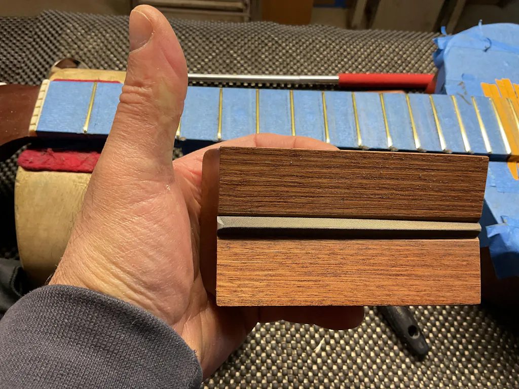 This tool has a unique design devised by the Luthiers at Crimson Guitars, safely and accurately files the fret ends to the required angle.