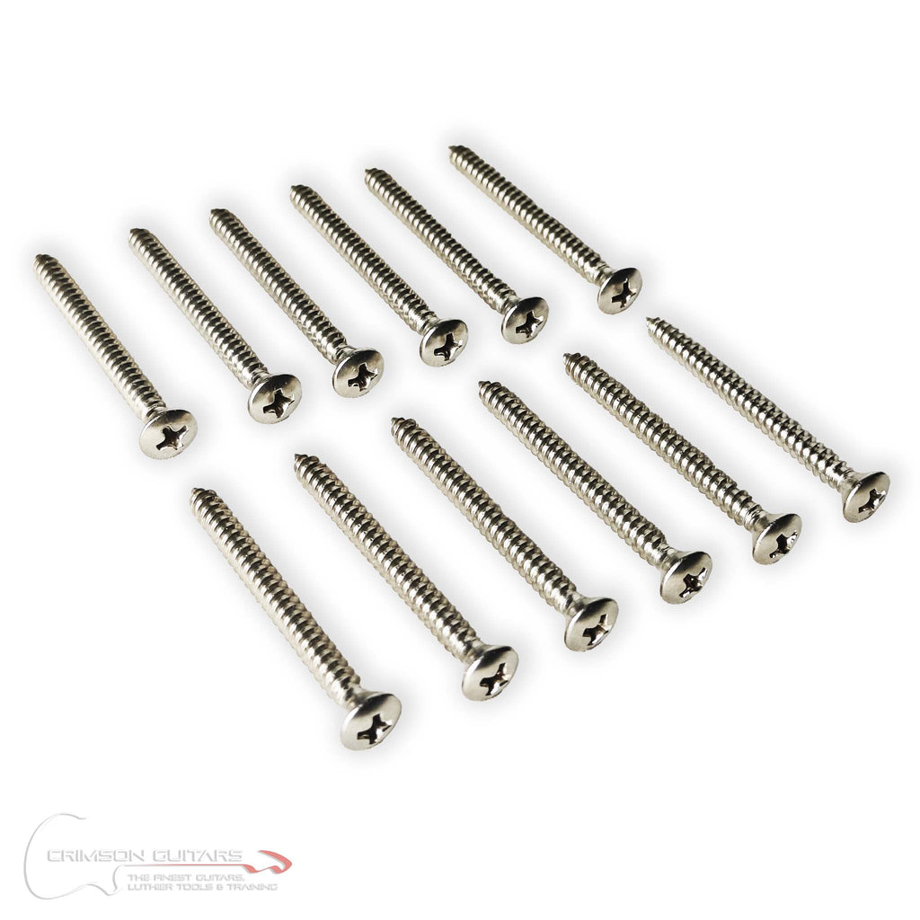 Domed/raised countersunk phillips head. Make sure to drill your pilot holes first before screwing in any guitar screws. Available in a set of 4 or as a set of 12.