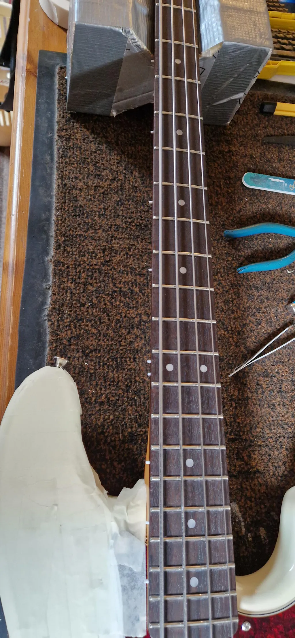 just the ticket, 2mm drill to 3mm depth, tiny spot of super glue insert rod cut of close to neck, carefully file / sand to a finish, great result, very pleased.